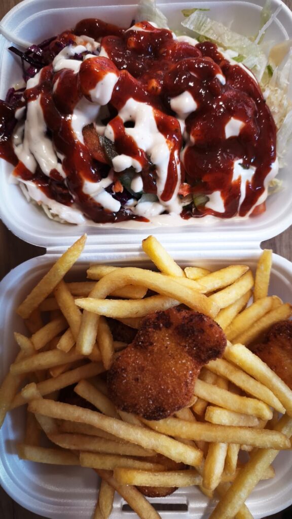 Ich fahre noch beim Kebab vorbei, wo ich Chicken mit Nuggets und einen griechischen Salat geniesse, ein Bier hat er nicht, aber ich habe noch eine Dose im Gepäck, die ich mir hole und so ist die Welt in Ordnung.
