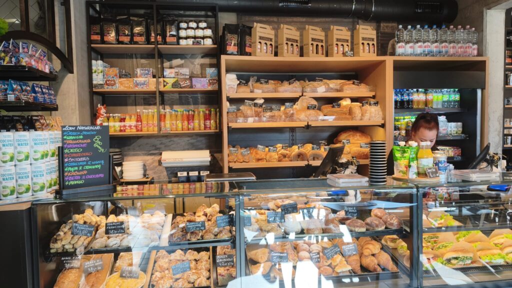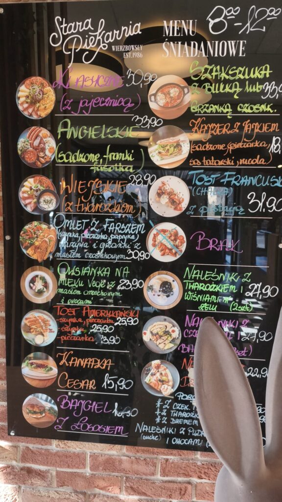 Einen 5 Minuten Morgenspaziergang und ich kann im schönen warmen Lokal ein Frühstück auswählen.