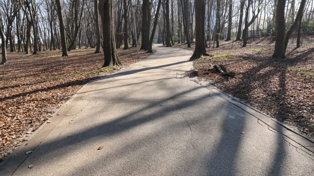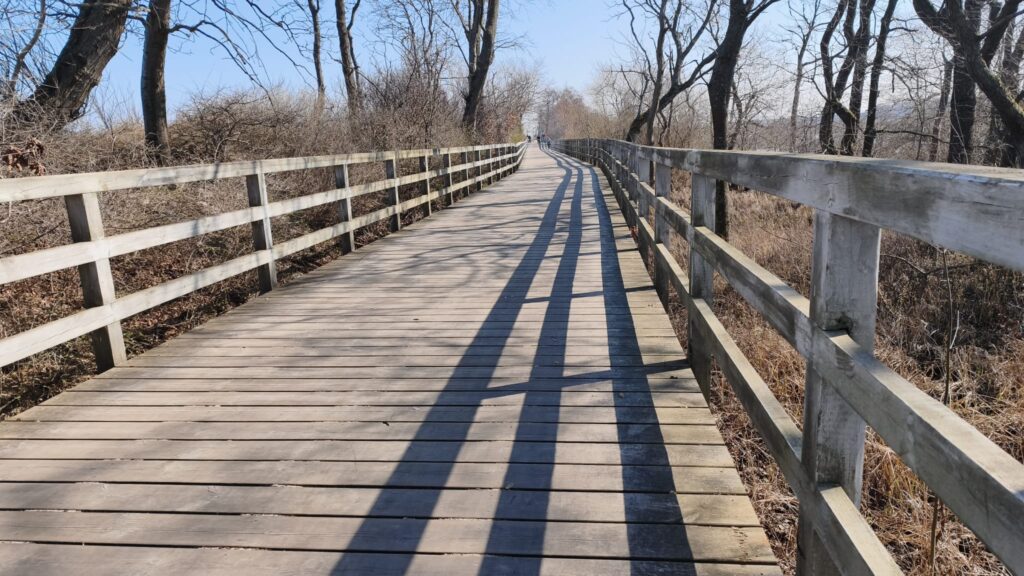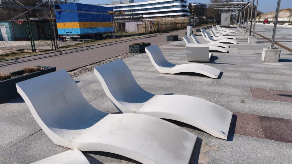 Nebenan einer breiten Fußgängerstraße, rechts davon mit vielen Verpflegungsmöglichkeiten. Auf der anderen Seite, der Sonnenseite stehen hunderte von Metern dieser Holzbänke.