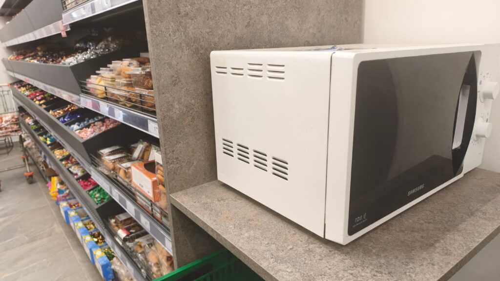 Nebst Wasser kaufe ich mir einen frischen Salat. Im Laden sehe ich auch eine Mikrowelle und Wärme mir den Rest meiner Pizza von gestern auf.