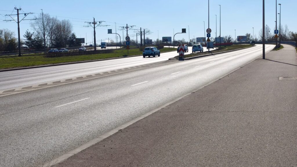Auf der vielspurigen Ausgangsstrasse ist es zuerst einmal vorbei mit romantisch, aber immerhin ist eine Spur für den Radweg vorhanden.