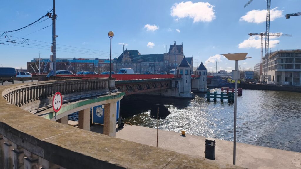 Hier führt der ganze Verkehr auf die riesige Brücke über die Oder und ich habe die tollste Aussicht und kann auch anhalten für dieses Aufnahme!
